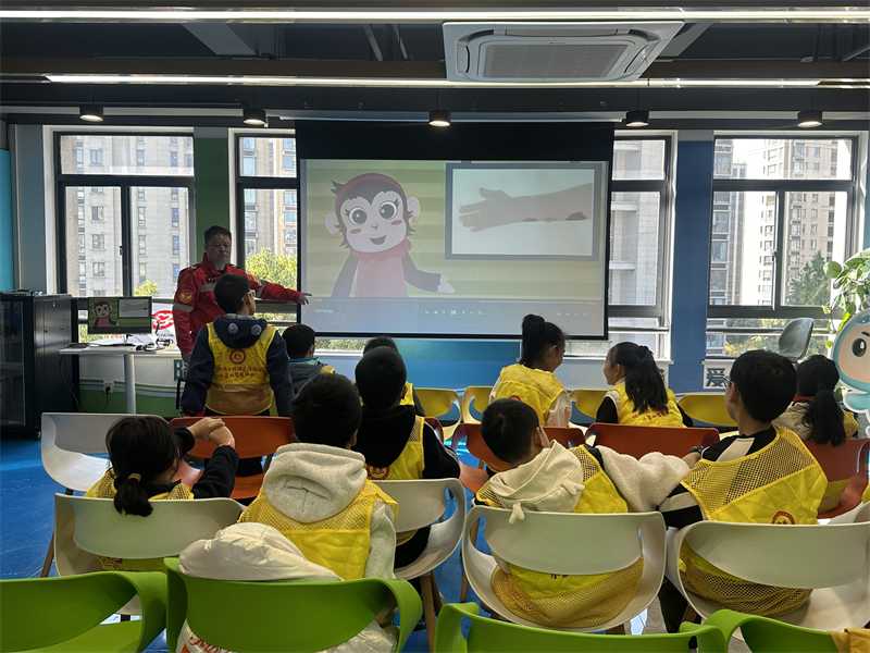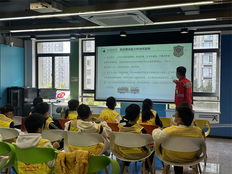 本次培训特别邀请到杭州市上城区民安公益救援中心理事长曹国华老师授课,拥有丰富应急救援经验的他,一开场便以“专业 +通俗”的风格抓住少年们的注意力。曹老师结合真实社区火灾案例,将原本抽象的消防常识转化为生动易懂的讲解:“去年某小区因电器老化起火,住户因慌乱中选错逃生方向险些被困,这正是缺乏基础消防知识的教训。”从火灾常见成因、家庭日常隐患排查,到火灾发生时的低姿匍匐、湿毛巾捂口鼻等逃生技巧,他层层拆解要点,还不时抛出问题与少年互动,现场小手纷纷举起,热烈的抢答氛围让知识吸收更高效。