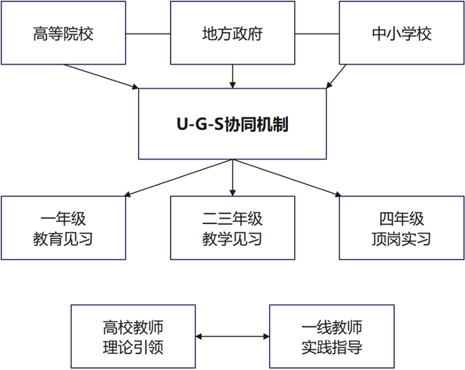 协同实践教学平台的搭建需突破高校单一主体培养模式,构建“高校—地方政府—中小学校”三方联动的U-G-S协同育人机制(见图1)。平台运行采取“全程浸润,递进发展”策略将实践教学贯穿师范生培养全过程:一年级开展教育见习通过跟岗观察建立对教师职业的感性认知,二三年级实施教学见习在导师指导下参与备课,听课与评课等教研活动,逐步掌握教学设计与课堂组织方法,四年级进行顶岗实习独立承担班级教学与管理任务,在真实情境中锤炼综合实践能力。平台建设强调双导师协同指导,高校教师侧重教育理论引领与反思能力培养,一线教师聚焦实践操作指导与经验传授,两类导师基于师范生实践表现开展定期研讨形成理论指导实践,实践验证理论的良性互动。