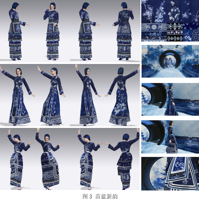 学生实践项目《苗蓝新韵》(如图3)以蜡染非遗技艺为核心,通过多平台在线系统收集蜡染素材并提取核心纹样。运用Photoshop和CLO3D等数字工具完成纹样绘制、版型设计及纹理模拟。最终呈现的虚拟服饰系列将传统文化与现代美学完美融合,展现了传统工艺与数字技术的相得益彰。该项目生动诠释了数字时代非遗的动态传承与创新表达。