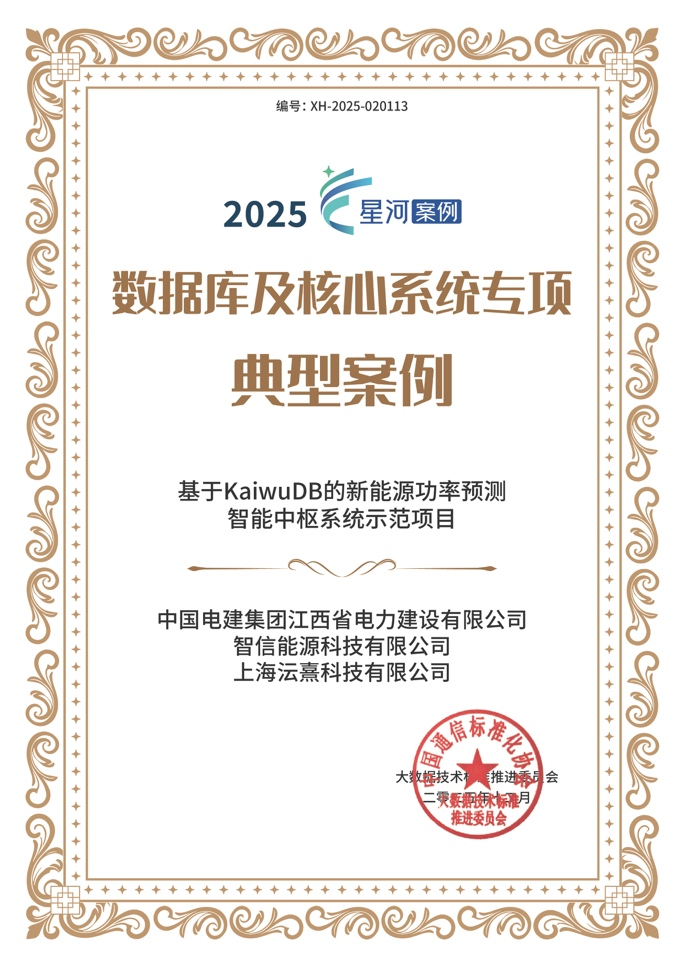 发布时间:2025-12-22 16:37:26 | 来源:中国网 | 作者: | 责任编辑:吴一凡12月18日,由中国通信标准化协会、中国信息通信研究院(简称“中国信通院”)主办的2025数据资产管理大会在京盛大召开。本次大会聚焦数据要素治理领域,重磅发布一系列极具前瞻性与洞察力的市场研究成果。作为大会的核心亮点环节,2025第九届数据智能“星河”案例评选结果正式揭晓。上海沄熹科技有限公司(简称“浪潮KaiwuDB”)与中国电建集团江西省电力建设有限公司(简称“江西电建”)、智信能源科技有限公司(简称“智信能科”)联合申报的“基于KaiwuDB的新能源功率预测智能中枢系统示范项目”从数百家单位提报的累计935份案例中脱颖而出,获评数据库及核心系统专项“典型案例”。