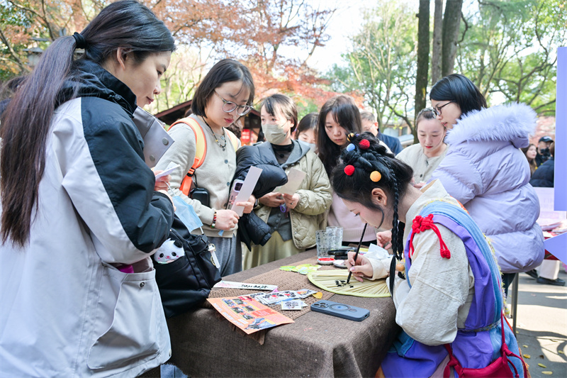 科技赋能让文化遗产焕发新生。“AR寻枫剧本游”深度整合AR技术,将飞来峰石窟文化、枫树故事融入数字叙事,串联起5个实景打卡点位,实现“虚实共生”的游览体验;更新后的“云上枫景”720°全景漫游平台,让游客通过公众号即可线上沉浸式赏枫。宋服枫叶妆、飞花令挑战等文化体验活动则进一步涵养城市温度,传递温暖氛围。