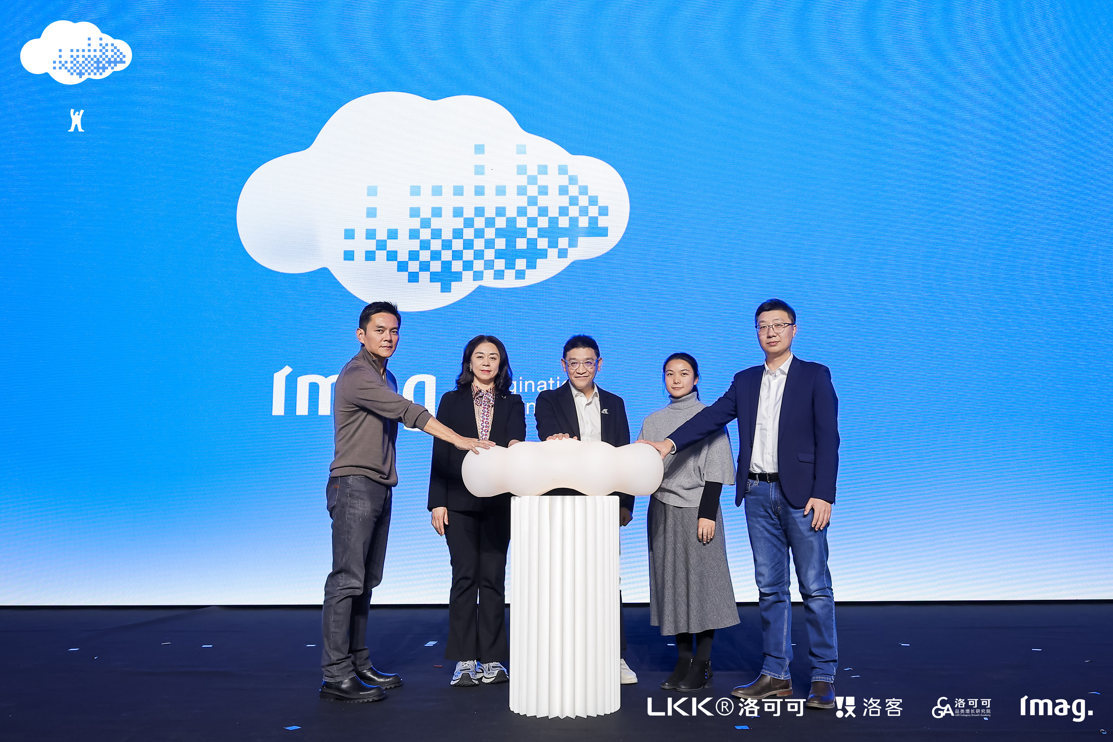 洛可可创新设计集团合伙人、副总裁蔚江在大会开场解读主KV设计理念。创作源于对“想象力”本质的追问,摒弃往届宏大科技与商业风格,回归本真。核心创意取自“imagination”简写:截取“imagine”去“e”加圆点,简洁精巧。视觉灵感源自两大意象:一是大自然最具想象力的载体千变万化的云朵,象征想象力的自由与灵动;二是人类探索世界的本能——从火把到手电,用微光照亮未知的探索精神,呼应洛可可21年来以产品创新探索商业边界的初心。