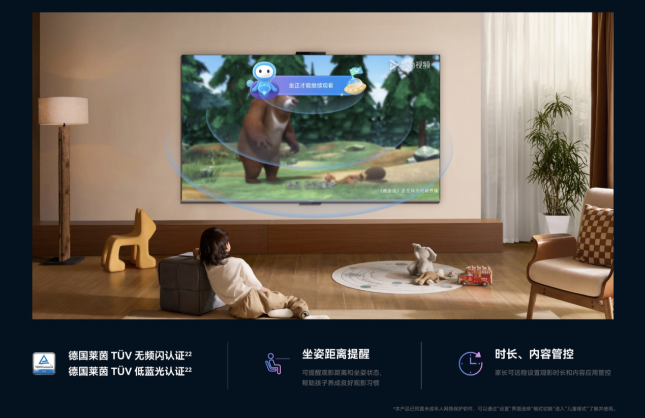 同时,它的AI摄像头可智能识别儿童坐姿与观看距离。当孩子坐姿不正或距离过近时,系统会及时提醒,帮助孩子从小养成健康观影习惯。家长还可通过智慧生活App,对观看时长、内容类型进行远程精细化管控,为孩子的健康成长保驾护航。此外,华为视频“少儿专区”还聚合了海量优质动画、绘本与儿歌内容,坚持安全、健康、正向的内容导向,让孩子在寓教于乐中开阔视野。