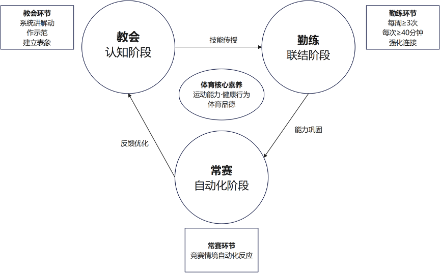 “教会,勤练,常赛”一体化模式基于运动技能形成规律与体育核心素养培育理论。运动技能习得经历认知,联结及自动化三阶段:“教会”通过讲解示范建立技术表象,“勤练”通过每周三次每次40分钟以上练习强化神经连接,“常赛”在竞赛中实现技能自动化,三者环环相扣。体育核心素养包含运动能力,健康行为及体育品德三维度,需协同培养:“教会”奠定认知基础,“勤练”巩固提升并养成习惯,“常赛”提供实战平台并强化品德。对216名学生的追踪研究显示,经两学年一体化培养,实验组在三维度得分分别比对照组高18.7%,23.4%和16.9%,证明该模式能显著促进核心素养全面发展,见图1。