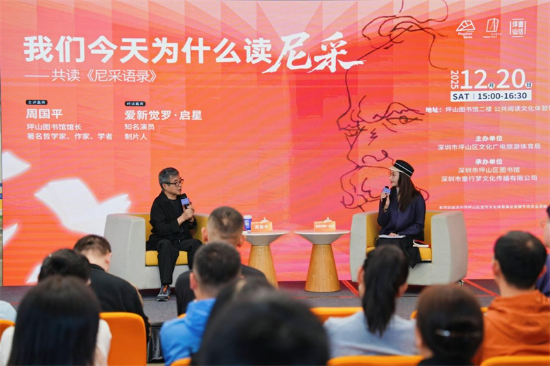 发布时间:2025-12-25 15:21:04 | 来源:中国网 | 作者: | 责任编辑:孙玥12月20日下午,深圳市坪山区图书馆二楼公共阅读文化体验馆座无虚席,“书话坪山”系列活动第45期以“我们今天为什么读尼采”为主题的《尼采语录》共读活动在这里隆重开启。本期活动主讲嘉宾是坪山图书馆馆长,著名哲学家、作家、学者周国平,特邀知名演员、制片人爱新觉罗·启星作为对谈嘉宾。活动分为对谈、共读与互动三个环节。这场跨越时空的思想对话,与线上线下读者一起点燃哲学的光芒。