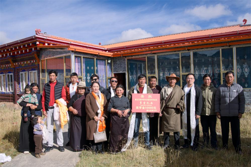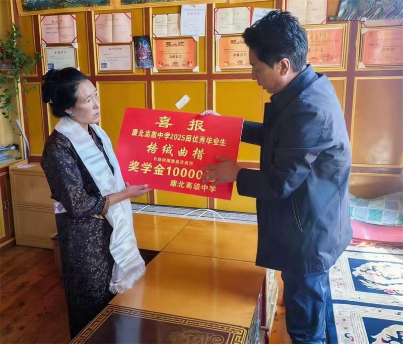 康北高级中学党委书记洼西同麦向学生家长送上奖学金