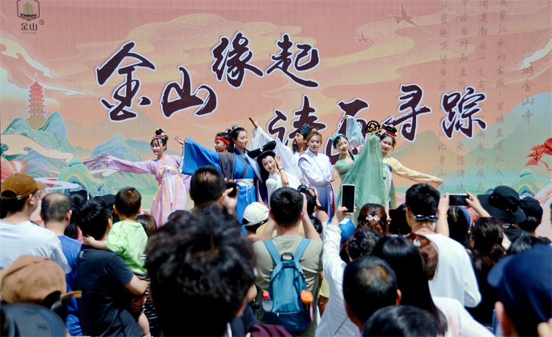 “洛阳亲友如相问,一片冰心在玉壶。”走近金山景区大草坪,就听见稚嫩的童声在背诵《芙蓉楼送辛渐》,原来有位小游客正在参与“金山缘起、诗画寻踪”活动。受主持人邀请,她正在背诵与镇江有关的古诗词,而该诗题目中的“芙蓉楼”就在金山。“我是刚刚经过芙蓉楼,看见了这句诗句,妈妈还考了我。”她的机智赢得了现场阵阵掌声,她也成功获得奖品文创手串一个。随后,主持人又问了几个与金山寺有关的问题,游客们各个都踊跃参与,抱得礼物归。