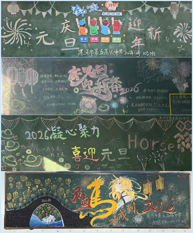 教室后方的黑板报,成为本次迎元旦活动的一道亮丽风景线。各班级围绕“辞旧迎新”主题,发挥奇思妙想,精心设计排版。同学们或挥毫泼墨书写新年寄语,或手绘插画展现节日盛景,或剪贴图文传递文化内涵,色彩斑斓的板报上,每一笔、每一划都凝聚着集体的智慧与创意。一块块黑板报不仅美化了教室环境,更成为班级文化的缩影,增强了同学们的集体荣誉感与归属感,让大家在合作创作中感受节日的喜悦。