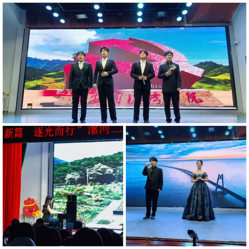 晚会中,师生同台的场景尤为动人。杨留洋老师与王菁同学的四手联弹《唱支山歌给党听》,琴声和谐,寓意深远;最终,晚会在梁智翔等同学激昂的男声小合唱《向往》中落下帷幕,歌声坚定有力,唱出了新时代青年对理想的不懈追求,完美点题“逐光而行”,将晚会气氛推向最高潮。