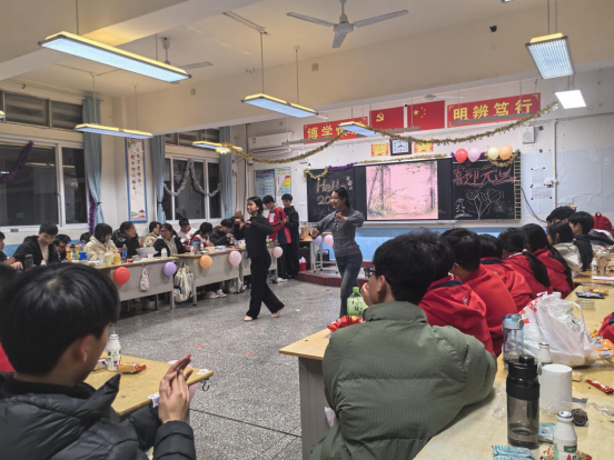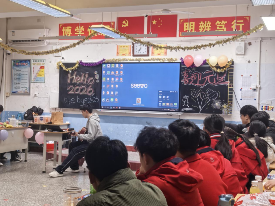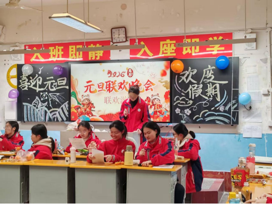 平日里书声琅琅的教室,早已被同学们巧手装扮一新。五彩的气球串起欢声笑语,鲜艳的彩带交织出新年愿景,黑板上“喜迎元旦”“岁启新程”的字样笔锋飞扬,角落的糖果与零食散发着甜香。课桌椅被重新排列,留出一方小小的舞台,灯光摇曳间,满是辞旧迎新的温馨与热烈。