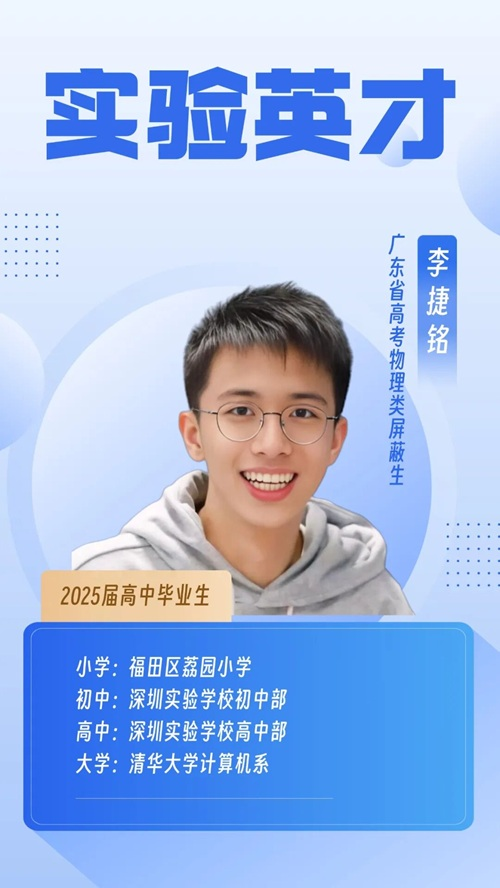 6月25日,广东省2025年高考成绩发布,我校李捷铭同学成绩排名全省前十被屏蔽,最后成功录取至清华大学计算机系。作为我校初中部、高中部接续培养的实验学子,李捷铭同学的成才之路彰显了我校贯通培养模式的强大优势。