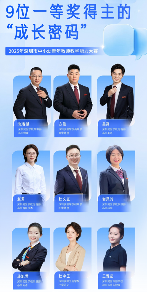 10月,在深圳市中小幼青年教师教学能力大赛中,我校9名教师夺得一等奖,排名全市第一;其中吴翔、杜文正、赵莉3位老师为一等奖第1名,获推荐参加省赛。12月,在第五届广东省中小学青年教师教学能力大赛中,我校吴翔老师、杜文正老师夺得一等奖第1名,赵莉老师夺得二等奖,展现实验教师精深的教学素养。