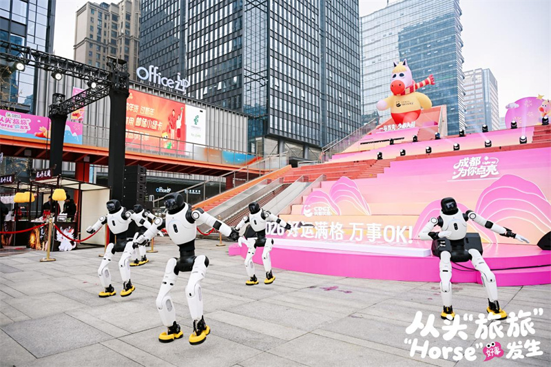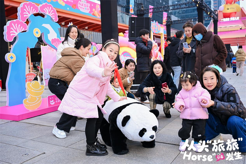 2025年12月31日一晚,大约12万名市民与游客奔赴交子大道,聚在双塔之下。天色未暗,市民、游客已络绎不绝进入成都文旅集团游园会。国风女童在“雪上飞”神马前留影,红帽阿姨在漫天飞雪中回忆青春,青年情侣手捧“福”字与神马同框,温婉母女与熊猫“胖花”来张自拍,三五稚童满园追逐机械熊猫,热情观众招呼机器人舞者,妙龄女子在红叶树下许下情缘,四代同堂在“好事成双”前来上一张全家福……