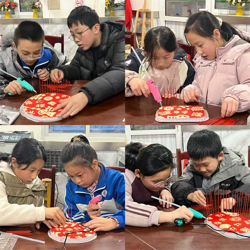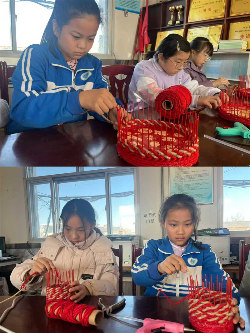 最考验创意与技巧的编花纹环节到来了!红绳在孩子们的指尖穿梭、缠绕、打结,简单的绳线在巧手下变成了错落有致的花纹。有的孩子编出经典的螺旋纹,有的尝试创意麻花结,原本单调的小棒框架,渐渐变成了带着“福”字元素、造型别致的篮筐,活动室里满是孩子们的成就感与欢笑声。