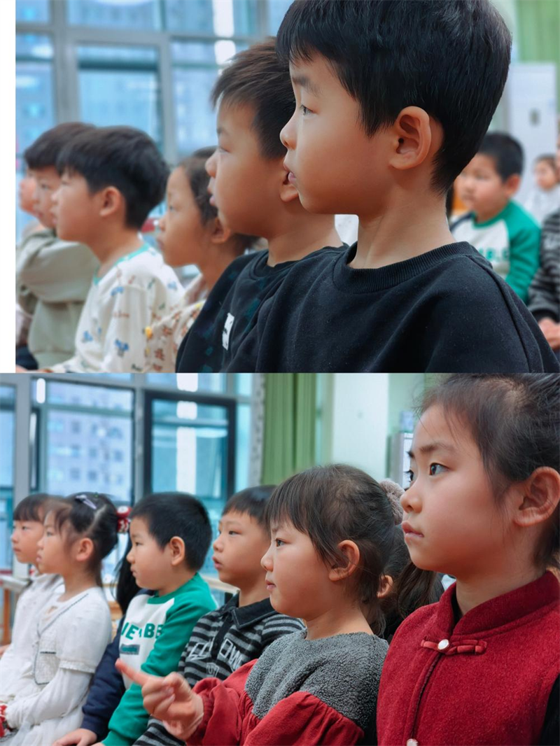在实践体验环节,孩子们变身“小小艺术家”,用充满创意的方式演绎象形字。三个小朋友相互配合,弯腰搭肩化作“木”字;伸展双臂、昂首站立,便成了“大”字;双手比出圆形罩在眼前,就是“目”字的生动写照,汉字在孩子们的肢体动作中“活”了起来。随后,孩子们拿起画笔,一笔一画描摹着“日”“月”“山”“水”等象形字,在笔墨勾勒间,感受着古人造字与自然万物的紧密联系。活动中,老师还融入了包含象形字的古诗片段,让孩子们在吟诵中进一步加深对文字的理解与记忆。