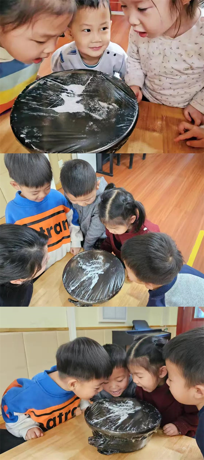 在老师的示范后,孩子们迫不及待地亲自参与实验。他们对着“鼓面”大声说话、唱歌,观察盐粒随着声音大小、高低的变化而改变跳动幅度,脸上满是惊喜与专注。“声音越大,盐宝宝跳得越高!”孩子们在实践中自主发现规律,真切感受到声音的力量与振动的奥秘。活动结束时,孩子们仍意犹未尽,纷纷表示要回家和家长分享这个有趣的实验。