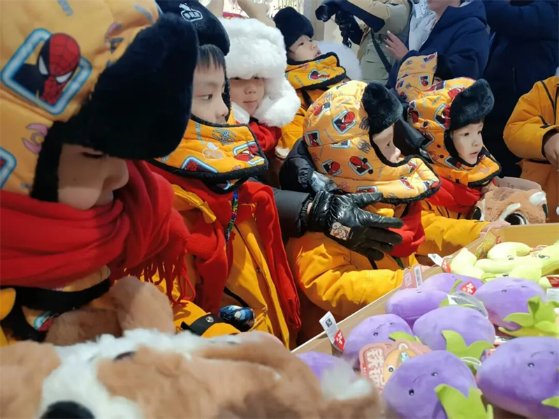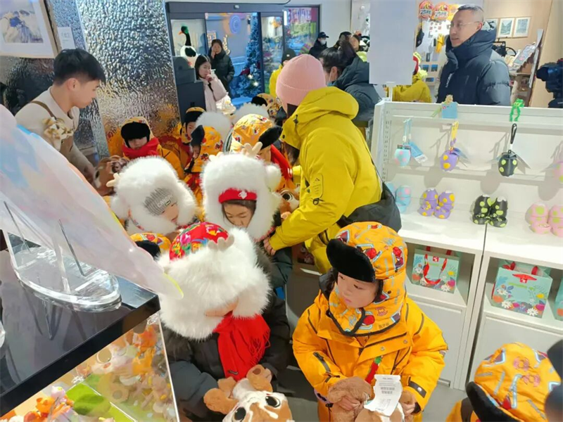 在恩都里休闲度假商旅社区北门,“喵里喵气”演绎互动可爱萌趣,长白山孩童变身“小人参娃”欢乐迎接,工作人员忙着搬运行李,砂糖橘、人参娃团队与酒店精心准备的伴手礼惊喜相逢。大东北的热情像火一样滚烫,让隆冬的长白山夜晚也充满暖意。