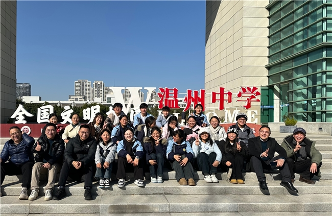 当日下午,师生们来到浙江省温州中学,受到曾赴阿坝开展教育帮扶的校领导及教师的热情接待。同学们漫步于湿地环绕的生态校园,感受与高原迥异却同样充满活力的江南教育氛围。在参观校史馆、数学馆以及运动场馆的过程中,两地学子虽远隔山河,却在共同的艺术爱好与青春活力中产生共鸣,迅速拉近了彼此的距离。阿坝县中学教师刘成志感慨:“温州中学在艺体教育和校园文化建设方面的宝贵经验,给我们带来了许多启发。希望未来能持续开展此类交流,让高原的孩子们看见更广阔的世界。”