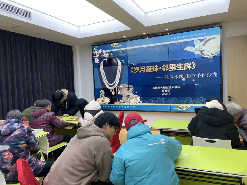 与此同时,金鱼井社区新时代文明实践站内也暖意融融,一场珍珠画DIY手作沙龙在此顺利举办。社区联合杭州万向职业技术学院设计创意系,邀请辖区老年人齐聚一堂,用五彩珍珠点缀福字、葫芦主题画版,在指尖创作中感受传统文化魅力,共享温馨时光。