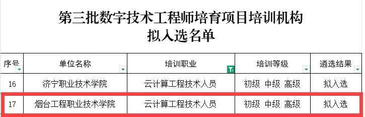发布时间:2026-01-15 15:37:25 | 来源:中国网 | 作者: | 责任编辑:孙玥近日,山东省人力资源和社会保障厅公布《关于公示我省第三批数字技术工程师培育项目培训机构拟入选名单的公告》,烟台工程职业技术学院云计算工程技术人员(初、中、高级)职业培训项目成功入选。