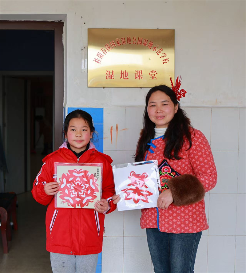 课堂之上,黎艳青老师以生动有趣的讲解,为孩子们搭建起非遗剪纸与湿地保护的桥梁。她不仅娓娓道来桂阳剪纸的历史渊源、折剪技巧,更将湿地中的飞鸟、游鱼、草木等自然元素融入剪纸教学,把剪纸里的“阴阳相生”与生态系统的“万物共生”巧妙结合,让孩子们明白剪纸的对称之美恰似湿地的生态平衡,每一处精巧的剪裁,都是对自然和谐的生动诠释。