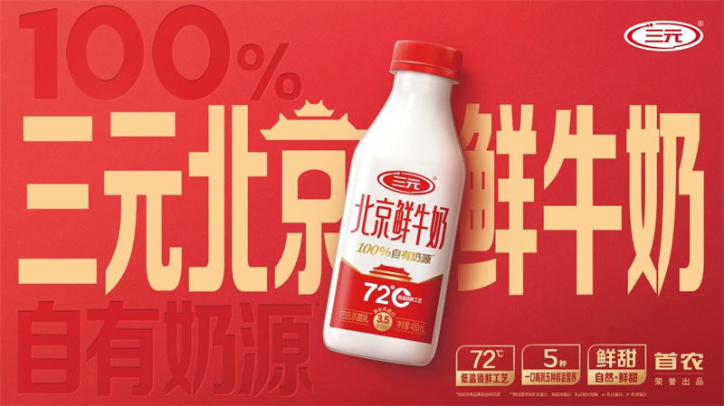 2025年9月,三元食品推出了名为“北京鲜牛奶”的新产品。这是一款升级版的72度巴氏杀菌低温牛奶,不仅蛋白质含量得到提高,还将“100%自有奶源”印在包装瓶的明显位置。