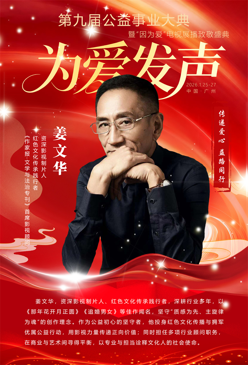 在盛典现场,姜文华还分享了对公益事业发展的思考与建议。他表示,公益事业的发展需全社会同心同行、久久为功,文艺工作者作为时代的记录者与传播者,更应肩负公益传播责任,将公益元素融入文艺创作全过程,让文艺作品成为公益理念的传播载体;同时要深入基层,精准对接公益需求,让文艺赋能公益更具针对性与实效性。对于未来的公益规划,他坦言,将继续坚守“光影传情、公益立心”的初心,一方面深耕影视与文艺创作,打造更多兼具公益温度与艺术价值的作品;另一方面持续躬身公益实践,走进更多社区、乡村、校园与工业园区,整合资源开展文艺公益活动,深耕退役军人就业创业服务工作,让文艺的温度与公益的力量,在更多角落绽放光彩。(李媛)