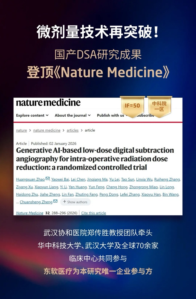近日,国产高端DSA研究取得重大突破!武汉协和医院郑传胜教授团队联合东软医疗及国内外多中心研究团队,在国际顶级医学期刊《Nature Medicine》(IF=50,中科院一区)上发表全球首个基于生成式低剂量DSA的前瞻性多中心随机对照临床试验(RCT)研究成果。