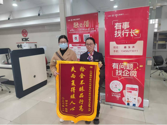 为表达感激之情,1月27日,胡女士将一面印有“拾金不昧品行高,失而复得暖人心”的锦旗送到该行,并亲手交到大堂经理谢妹芳手中。为客户找回丢失物品,这是工行嘉兴北京城支行践行“以客户为中心”服务理念的一个缩影,既挽回了客户的损失,又让客户体验到了真正有温度的服务。(龚萱)